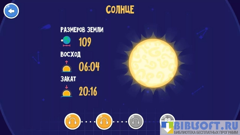 Астрономия для детей - Android приложение, выполненное в стилистике познавательной игры для весёлого изучения тайн космоса. Просматривайте анимационные мультфильмы с познавательными историями о формировании Земли, создании первых телескопов и путешествиях к звёздам. Поднесите тыльную камеру устройства к звёздному небу и узнайте местоположение, название и значение всех созвездий, выделенных забавными рисунками.
