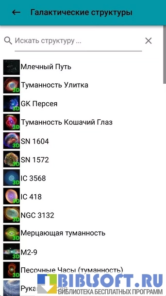 - Отображает на экране список из 63 категорий галактических структур, выводит соответствующие подкатегории при нажатии на выбранную категорию, и соответствующие страницы с описанием небесных тел – при нажатии на подкатегорию к которой они относятся.