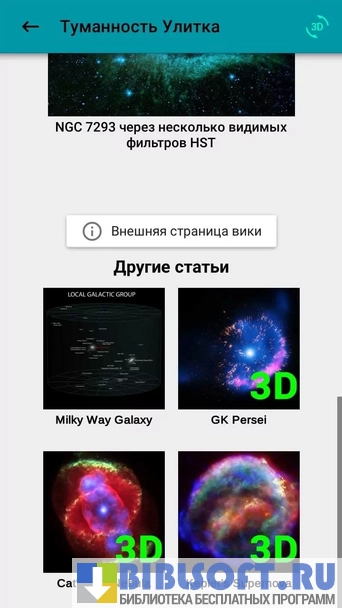 - Выводит подробное описание выбранных небесных тел из Википедии, и их детализированные фотоснимки в высоком разрешении, полученные с телескопов Хаббла и Спитцера, а также рентгеновского аппарата Чандра;