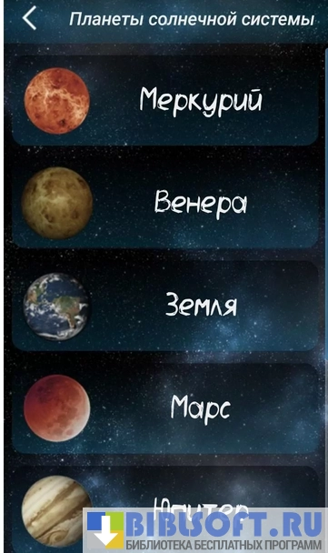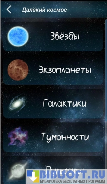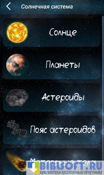 - Отображает перечень статей о космических телах и явлениях соответствующего подраздела, при нажатии на него;