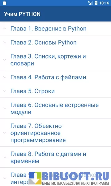 Учим ПИТОН.PY — образовательная платформа на Android для самостоятельного обучения программированию на популярном языке Python. Курс представляет собой сборник полезных материалов по разработке сайтов и созданию искусственного интеллекта. Уроки представлены в виде информативных лекций с описанием практических примеров по темам. Подача материала организована простым и доступным языком даже для новичка, который впервые сталкивается с понятиями «синтаксис» и «функции».