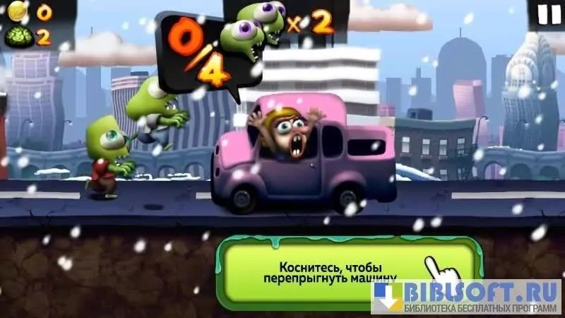 Zombie Tsunami — веселая аркада для Android, гонка зомби за прохожими, попадающимися на их пути. Управляется игра одним кликом в любом месте экрана. В зависимости от того, насколько долго задерживается палец на тачскрине, персонажи могут прыгать, перескакивать через пропасти, бежать с разными скоростями, кувыркаться в воздухе. Начиная игру с одним зеленым героем, уже вскоре пользователь обнаруживает, что ему подчиняется целая толпа подробных существ. Они появляются после того, как зомби, уже начавшие свой забег по городу, съедают очередного зазевавшегося прохожего.