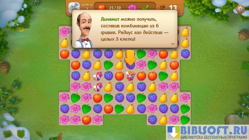 Иногда на игровом поле появляются бонусные элементы: динамит, который взрывает все фрукты поблизости.