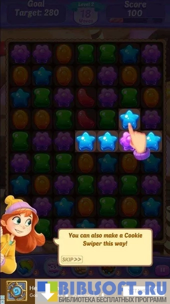 Cookie Crush Match 3 – игра для Android, использующая известную концепцию «три в ряд». Игрок должен менять конфетки местами, чтобы три (или более) одинаковых стояли друг с другом и взрывались. Подобным образом нужно очистить всю доску и набрать максимальное количество очков. Комбинации из особых внутриигровых предметов могут вызывать огромные взрывы.