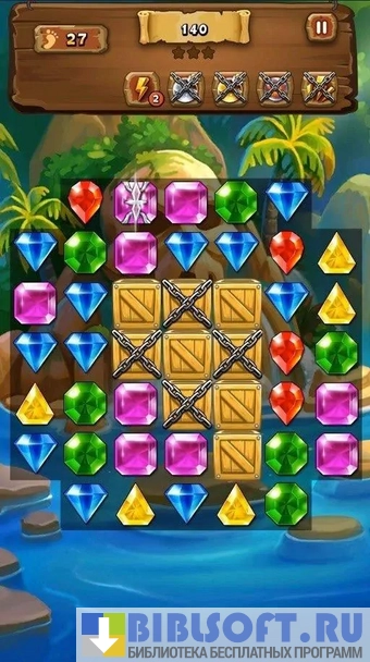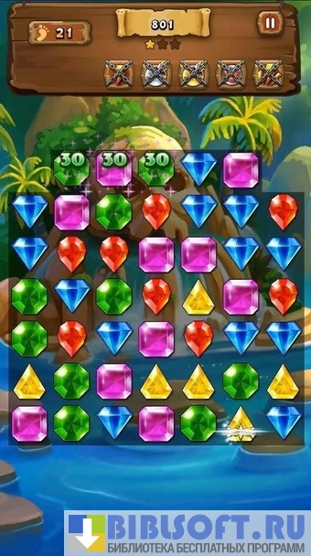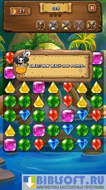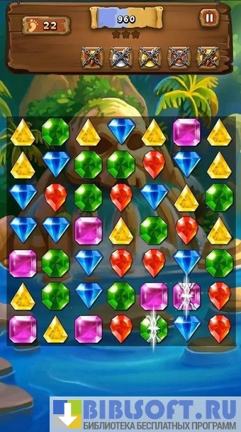 - Складывайте одинаковые фигурки, чтобы выполнить специальное островное задание, не забывая при этом собирать золото, драгоценности и карты;