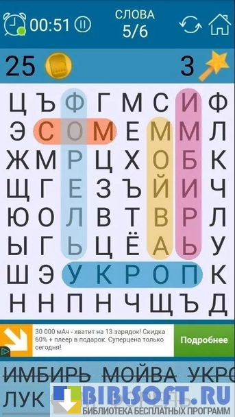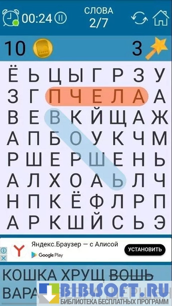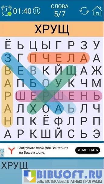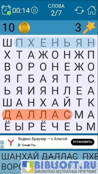 Поиск Слова – увлекательная головоломка для Androidq, в которой на квадратном поле необходимо находить спрятанные слова. В игре имеются уровни разной сложности, начиная от легкого квадрата 5х5 и заканчивая экстремальным полем размером 20х20.
