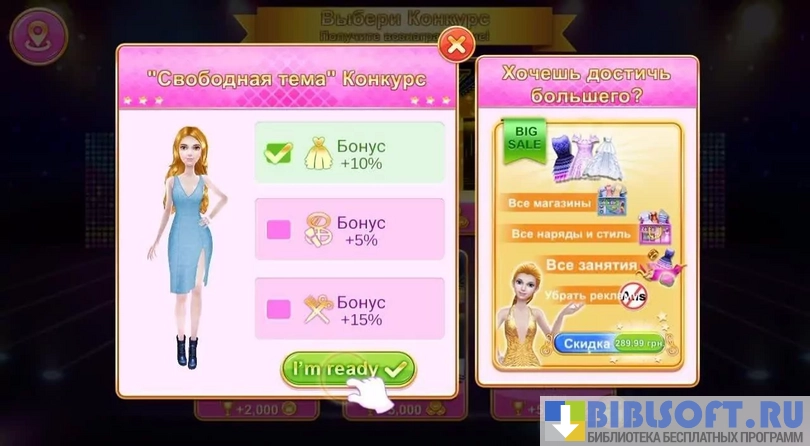 В нем выбираем тип мероприятия - VIP, свободная тема, балет или вручение музыкальных наград. Имея макияж и прическу, шансов на победу будет больше. Далее выбираем спецэффекты, которые будут тебя сопровождать. Проходя по подиуму, надо собирать лайки в синих кружочках и не трогать красные, а то твоя героиня будет спотыкаться!