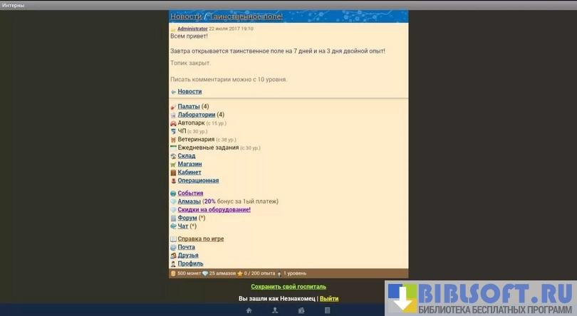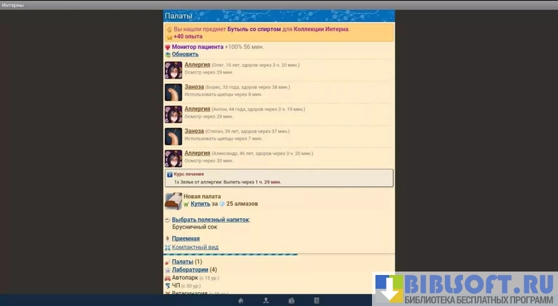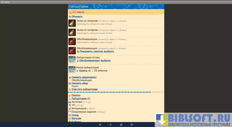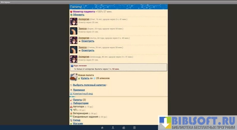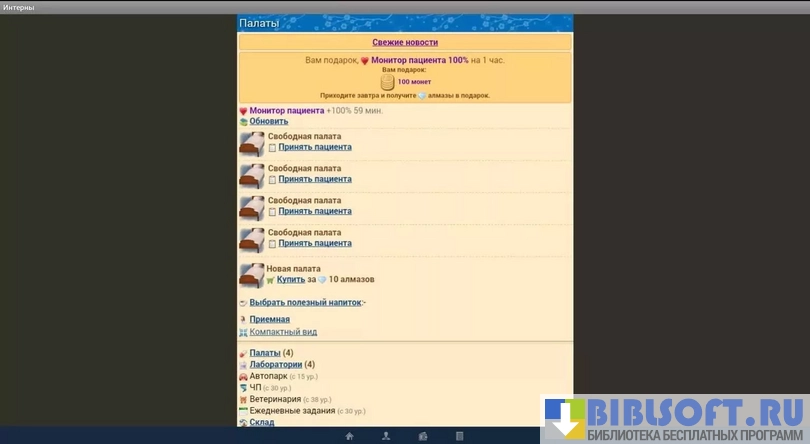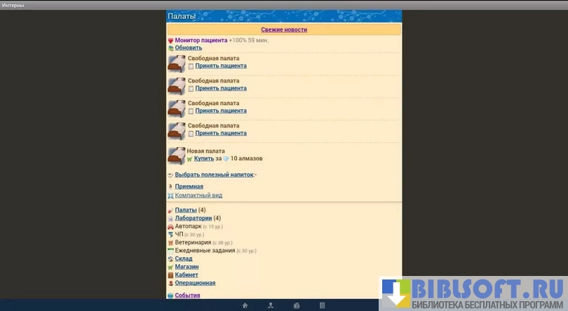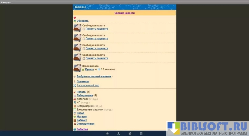 На начальном этапе в вашем распоряжении будут только лаборатория, несколько палат, магазин, операционная и склад, а лечить вы сможете легкие недуги типа заноз или мигрени. Повышая репутацию учреждения, покупая оборудование и транспорт, вы сможете развить небольшой медпункт до солидного госпиталя и отправлять персонала на неотложные вызовы.