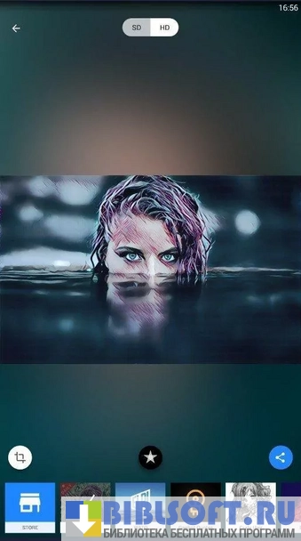 Программа предлагает множество фильтров, основанных на известных картинах (например «Крик» Эдварда Мунка). После применения фильтра можно уменьшить или увеличить его интенсивность, проведя пальцем по экрану влево. После этого отредактированную фотографию нужно сохранить в Галерее или Загрузках.