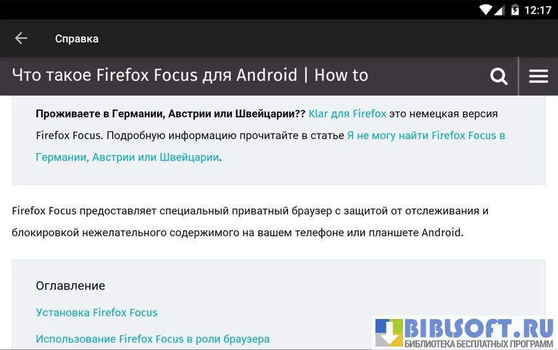 Firefox Focus – браузер с предустановленными утилитами безопасности для Android. Позволяет серфить интернет не опасаясь слежения, просматривать сайты без отправки рекламных мета-данных и скачивать файлы через защищенные криптографическими алгоритмами шифрования шлюзы.