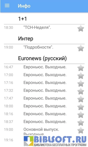 - Наличие возможности посмотреть программу запланированных телепередач и отметить понравившиеся как избранные;