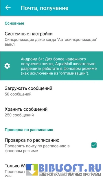 Пользователь может проверять письма в фоновом режиме, задавать размер сообщений, которые могут загружаться автоматически.