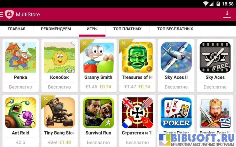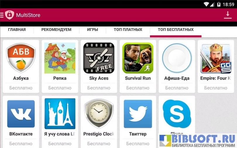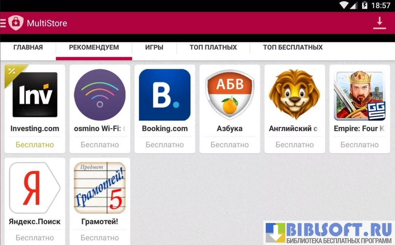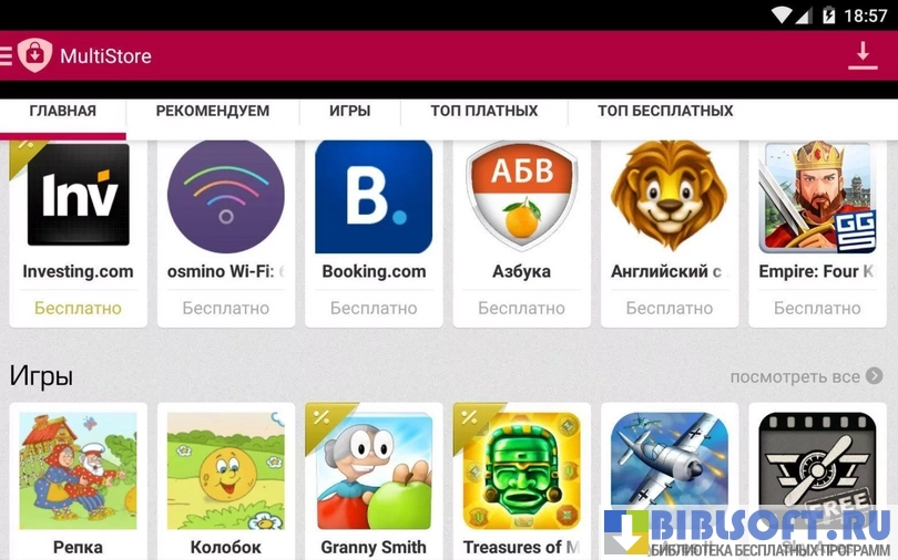 - разделы с бесплатными и рекомендованными приложениями и играми (других разделов нет);