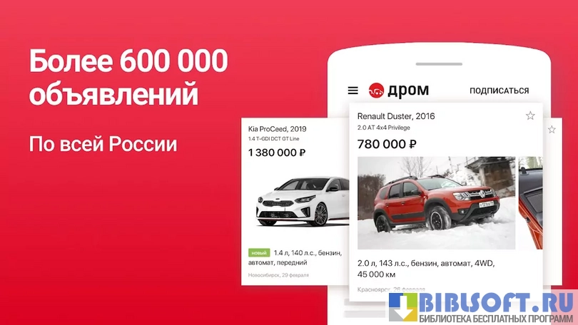 Дром — база объявлений о продаже автомобилей. Размещать предложения могут физические лица и автосалоны. Выгодно продайте ваш автомобиль или подберите новую машину в соответствии с предпочтениями. Для поиска машины нужно ввести модель, год выпуска и прочие параметры — система быстро подберет подходящие объявления. Есть функция проверки истории автомобиля с помощью VIN. Можно узнать историю машины, ограничения на регистрационные действия, количество ДТП, нахождение в розыске, пробег и т.д. Предусмотрен раздел с отзывами, где автолюбители могут делиться опытом относительно определенной модели авто.