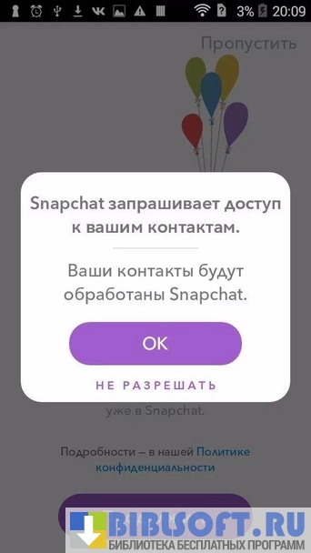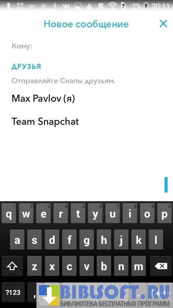 Snapchat – программа- мессенджер для мобильной платформы Android, позволяет пользователям обмениваться текстовыми сообщениями, фотографиями и короткими видеоклипами.