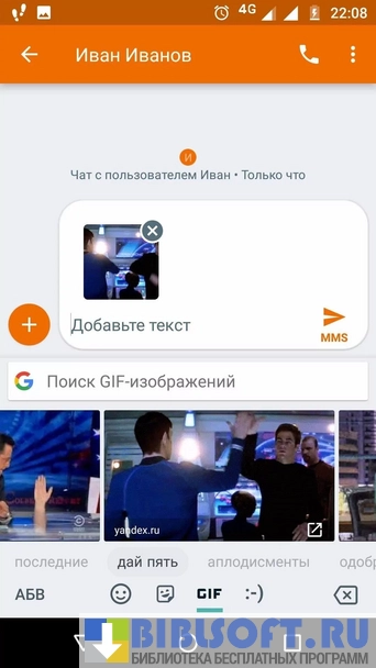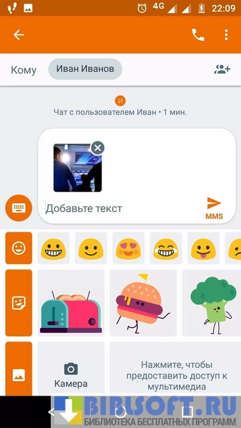 - Программа работает на устройствах Android™ 4.4 и более поздних версиях. Разработчики внедрили кнопку "+" для добавления в чат переписки смайликов и стикеров.