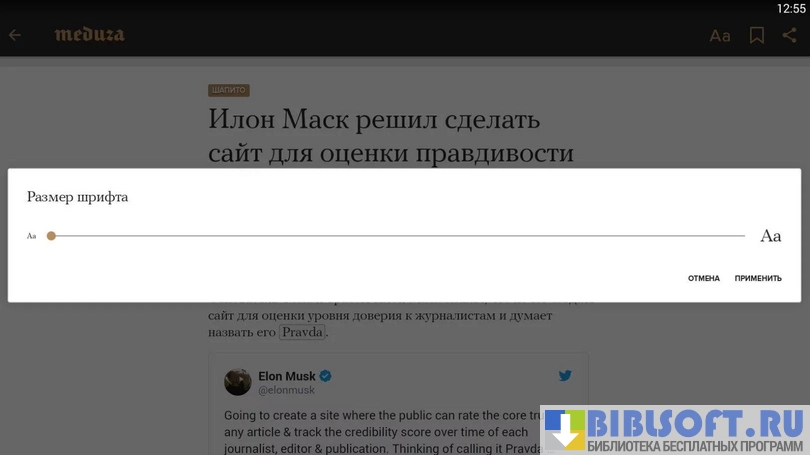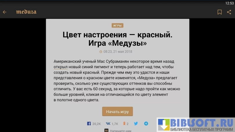 Meduza - приложение для просмотра одноимённого новостного сайта на Android устройствах. С помощью клиента можно просматривать ленту и добавлять понравившиеся новости в закладки.