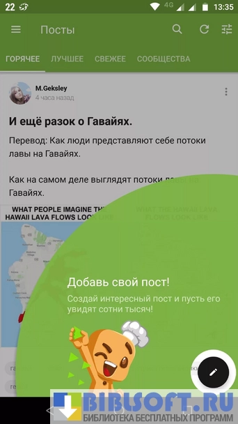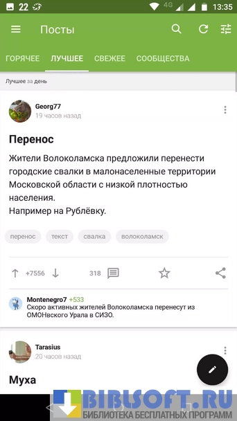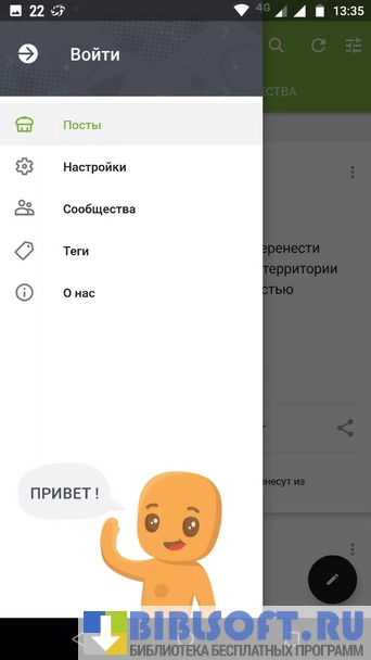 После запуска приложение отображает самые актуальные посты на текущее время с предложением поделиться новостью. Клиент сайта предлагает войти в учётную запись или зарегистрировать нового пользователя, т.к писать на ресурсе анонимно нельзя. Для чтения и просмотра постов этого не требуется. Авторизованным пользователям доступен личный кабинет, возможность комментировать посты, просматривать личную ленту и добавлять в игнор-лист непонравившиеся посты, людей или определённые теги.