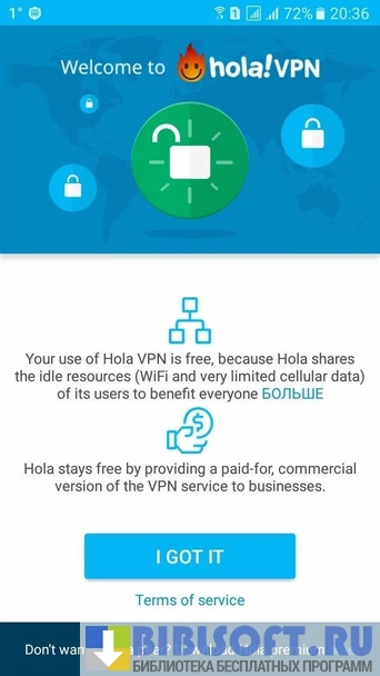Приложение Hola Бесплатный VPN для Android имеет ряд основных преимуществ, разрешая проблему запрета доступа к разного рода интернет ресурсам и контенту по всему миру. Hola предоставляет полностью анонимный доступ к желаемому контенту.