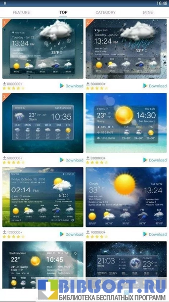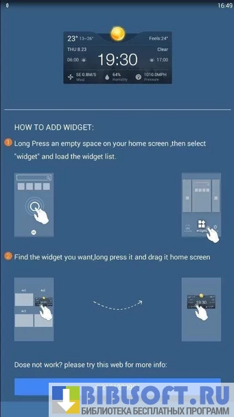 HD Widgets Free – обширный пакет виджетов для Android телефонов и планшетов. Включает более 100 элементов интерфейса. Пользователь получает возможность настраивать единицы отображения температуры, периодичность обновления информации, способ определения местоположения, уведомления о смене погоды, осадках, направлении и скорости ветра. Предусмотрена смена формата времени, даты, города и метеослужбы. Имеются виджеты для будильника, батареи, индекса качества воздуха и т.д. Для добавления виджета просто нажмите на экран и выбирайте соответствующий пункт в открывшемся меню. После загрузки списка виджетов найдите нужный и перетащите на экран. Можно индивидуально настраивать каждый элемент, меняя фон, шрифт, размер, цвет и т.д.