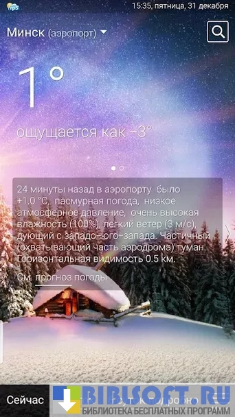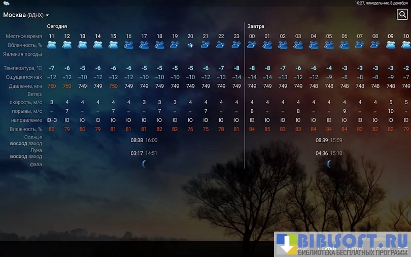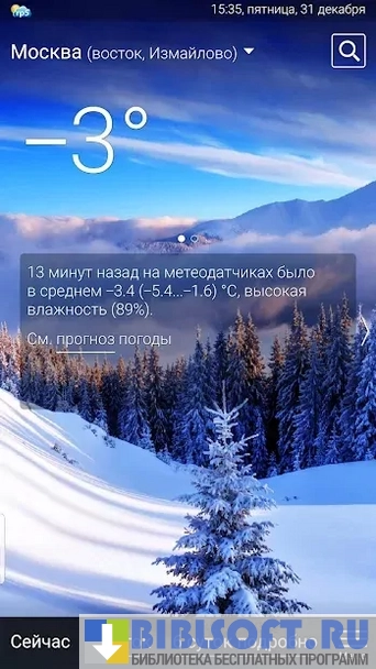- Красивый интерфейс. Создатели программы смогли сделать просмотр прогноза погоды приятным занятием. Перед пользователем появляются горные, морские и лесные пейзажи в зависимости от метеорологических условий. Вверху находится крупная надпись, обозначающая температуру за окном. Ниже приводится информация о влажности воздуха, скорости ветра и атмосферном давлении;