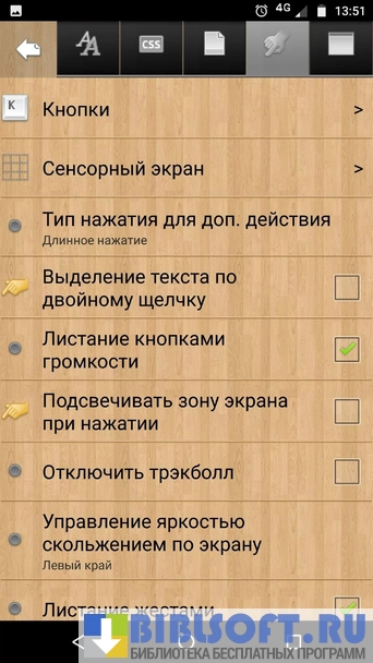 Настройки читалки можно изменять, например, сортировать книги по названию, автору, времени загрузки файла (по возрастанию или убыванию). В программе доступна функция автолистания, содержание, список предыдущих просмотренных или прочитанных книг. Нужные страницы можно добавлять в закладки. При выделении текста его легко скопировать, перевести в словаре, добавить свой комментарий или даже внести исправления, отправить выделенную цитату пользователям соцсетей или поделиться ей с помощью электронной почты, текстового сообщения или популярных мессенджеров, установленных на устройстве. Шрифт и межстрочные интервалы также меняются в зависимости от предпочтений пользователя. Он же выбирает и режим просмотра, ориентацию страницы (альбомная или книжная), цвет текста, фон и его текстуру (имитация станиц старой книги, мелованная бумага, металл, дерево и т.д.), режим чтения (ночной или дневной). Ночной режим подходит не только для чтения книг в темное время суток, но и для экономии заряда батареи во время использования устройства при ярком солнечном освещении.