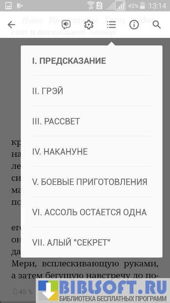 Настройка текста проводится уже после открытия книги. Нажатие на верхнюю треть экрана открывает доступ к размеру шрифта, межстрочным интервалам, оформлению страницы (белая, черная, сепия). Здесь же задается скорость самой анимации, блокирование экрана или запрет на это действие, управление громкостью, размер полей на страницах, эффект прокрутки и пр.