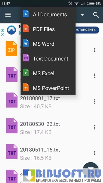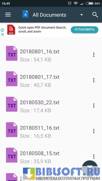 Позволяет объединить все имеющиеся на смартфоне текстовые файлы в единый информационный каталог. Документы удобно каталогизируются по типу, размеру и дате создания. Поддерживаются следующие форматы – PDF, Word, TXT, RAR, ZIP, PPT, Excell и др.