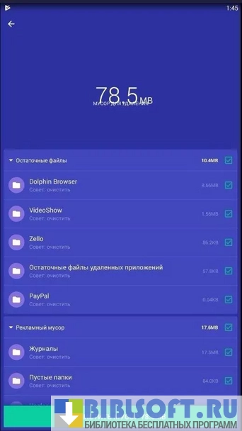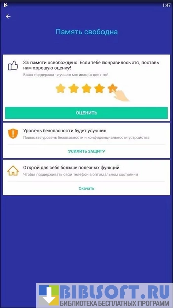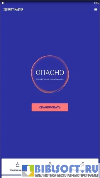 На главном экране расположена кнопка запускающая сканирование телефона, при котором выполняются: полная проверка на наличие вирусов, очистка от мусора и ускорение смартфона, путем закрытия фоновых приложений.