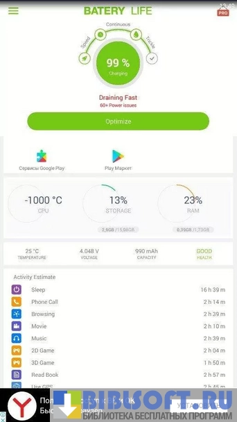 - Определяет степень расхода процессорного ресурса запущенными приложениями, и выводит (по запросу) время, в течении которого можно использовать «отмеченное» приложения до разряда батареи;
