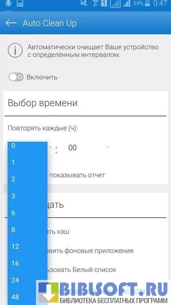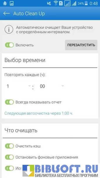 - Автоматическая оптимизация устройства с определенным интервалом (очистка кеша и остановка ненужных приложений в установленный период);