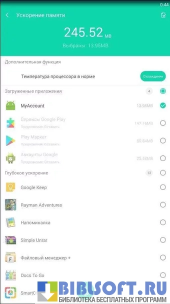 - очистка оперативной памяти путем автоматического или ручного выбора отключаемых процессов;