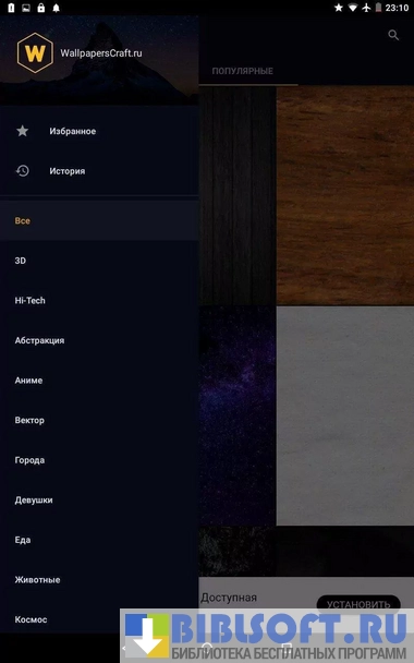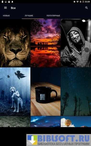 - поиск нужных изображений осуществляется по категориям, а также по тегам. Приложение содержит стандартных категории: города, страны, животные, космос, еда, аниме и многи другие. Кроме того, доступны обои с 3D графикой.