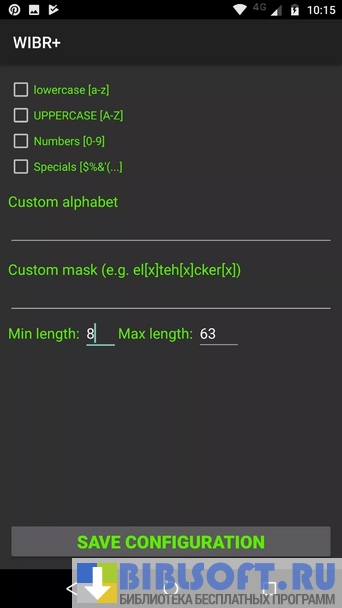 Тест “bruteforce” позволяет выбрать длину пароля, тип алфавита и приложение начнёт сканировать все возможные комбинации. Такой способ очень долгий, т.к. число комбинаций будет расти с длинной пароля, поэтому этот способ поддерживает маску. К примеру, известно, что пароль начинается на “password” и имеет две цифры. Устанавливается маска password[x]. Останется добавить только алфавит цифр для [x], а утилита подберёт все пароли от “password00” до “password99”. После того как пароль будет подобран, ваше устройство подключится к сети и запомнит найденные значения. Из-за специфики приложения, антивирусами определяется как вредоносное, но таковым оно не является.