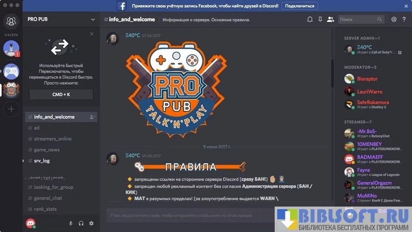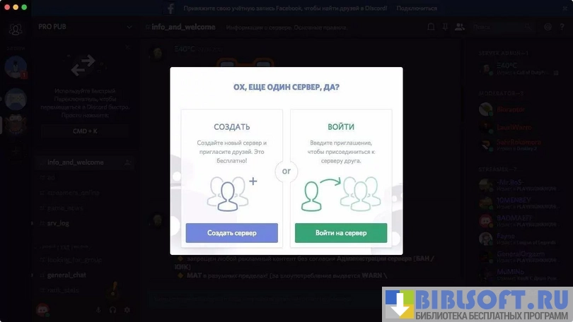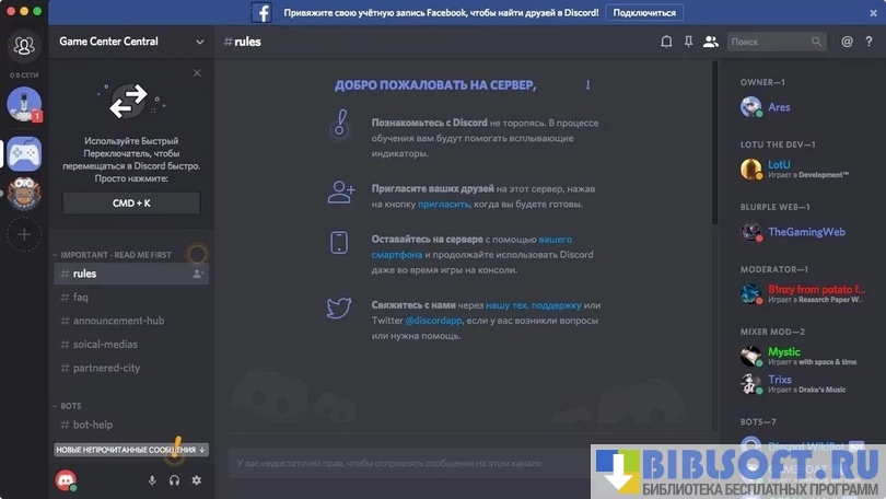 - создание каналов для текстового и голосового общения;