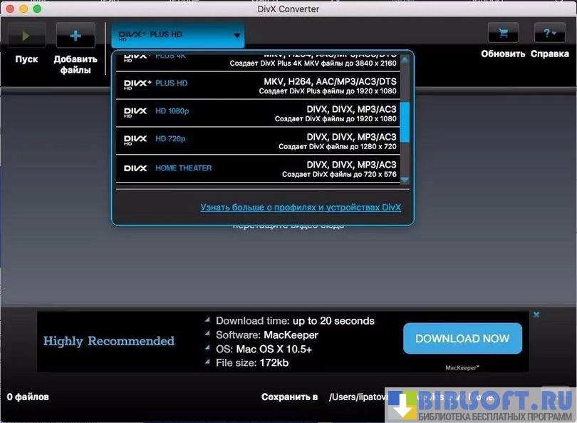 - Возможность воспроизведения и конвертации видеороликов в 4К (шаблон DivX HEVC UltraHD);