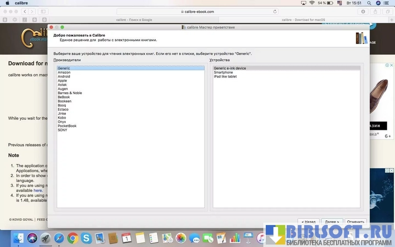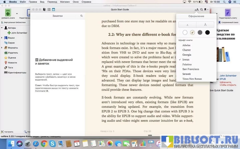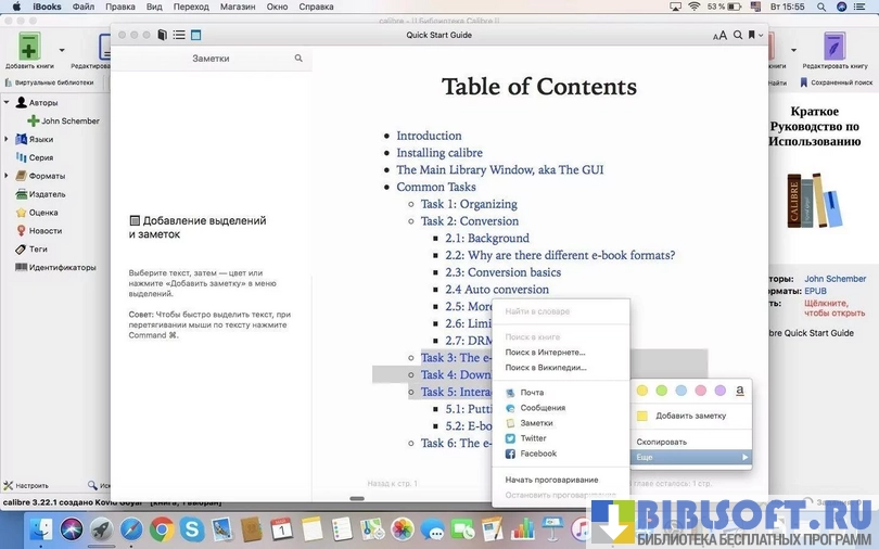 Calibre – симбиоз интерактивной библиотеки, виртуальной «читалки» и конвертера «книжных форматов» для macOS. Позволяет находить, загружать и категоризировать виртуальную литературу самой разной тематической направленности.