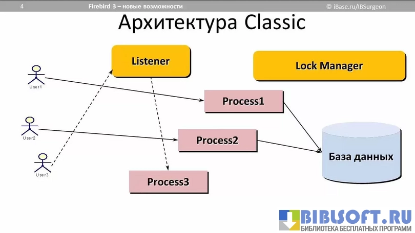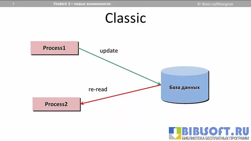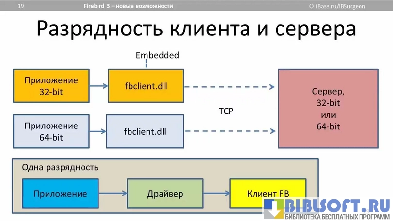 Соответствует протоколу ACID, благодаря чему пользователи могут производить информационные транзакции с помощью OLTP и OLAP запросов параллельно - не мешая друг другу. Умеет интерпретировать процедурные запросы PSQL. Поддерживает возможность синхронизации посредством C/C++ и Delphi-компонентов. Может считывать библиотеки fbclient.dll и GDS32.dll напрямую – без необходимости их подключения.