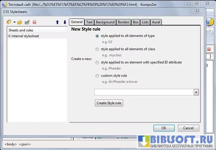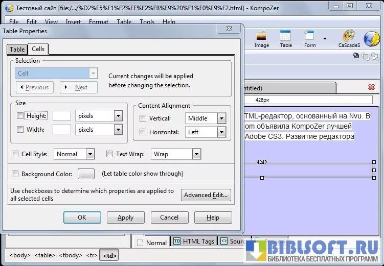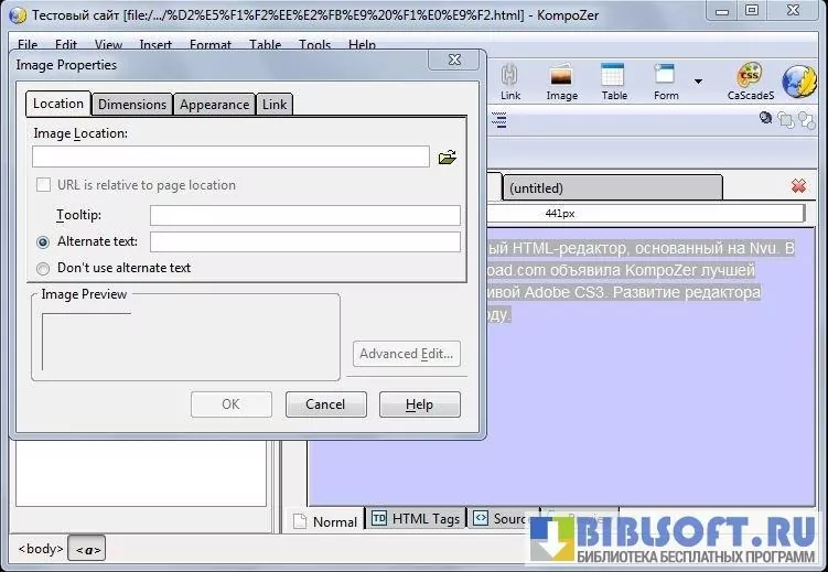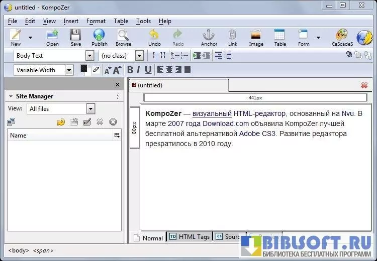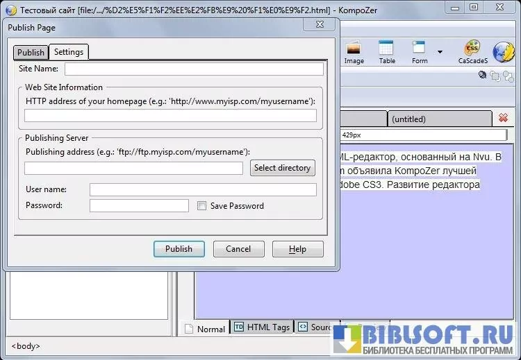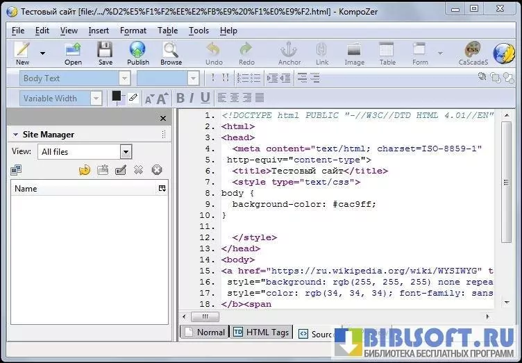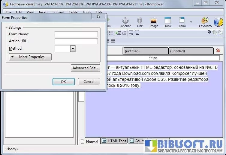 KompoZer – интерактивный html-редактор для Windows. Может взаимодействовать с несколькими html-страницами одновременно, с помощью вкладок. Имеет встроенный FTP-клиент для отправки результата работы/загрузки подлежащих изменению страниц на ПК пользователя.
