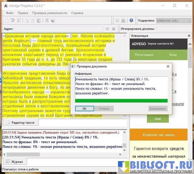 Программа нетребовательна к ресурсам системы и запустится даже на устаревшем офисном ПК. Advego Plagiatus будет полезен не только вебмастерам или копирайтерам, но также и преподавателям школ и ВУЗов для обнаружения неуникальных рефератов и курсовых проектов, скачанных из Интернета.