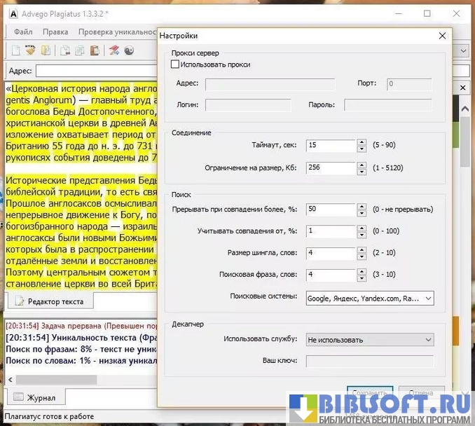 Чтобы избежать блокировки от поисковика, пользователь может скрыть собственный IP-адрес. При работе с Advego Plagiatus приходится периодически вводить капчу, однако это же случается и при использовании аналогичного софта – например, Etxt Антиплагиат. В настройках программы можно подключить API одного из севрисов по распознаванию капчи.