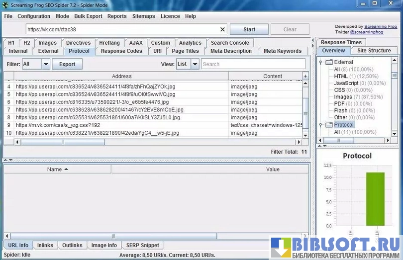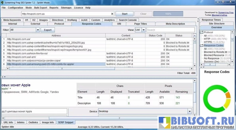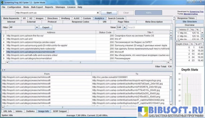 Screaming Frog SEO Spider проводит анализ сайта и указывает на ключевые показатели по всем найденным страницам, стилям, скриптам и изображениям. Все данные размещаются в разных разделах и могут быть отсортированы и отфильтрованы для более удобного отображения и быстрого поиска цепочек перенаправления.