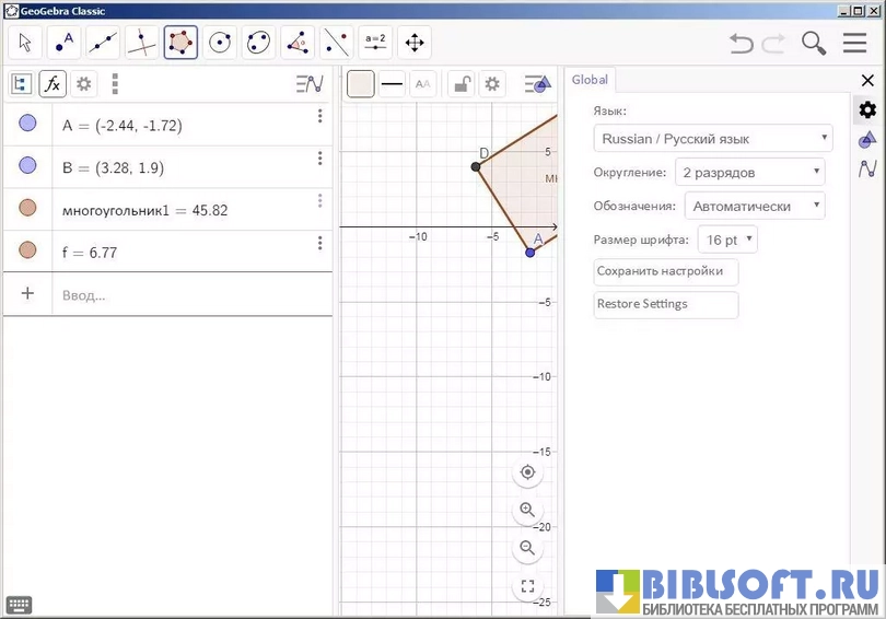 GeoGebra – универсальный интерактивный калькулятор для Windows. Предназначен для решения арифметических, алгебраических, геометрических и тригонометрических, статистических и иных математических задач.