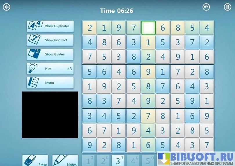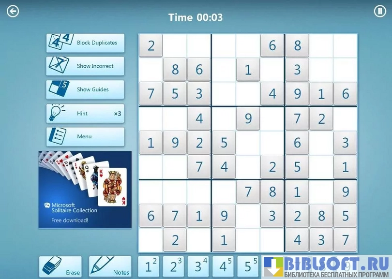 - Выбирайте уровень сложности, и располагайте цифры в квадратах таким образом, чтобы они не повторялись в горизонтальных и вертикальных рядах;