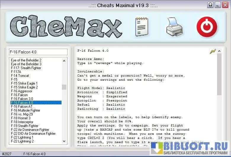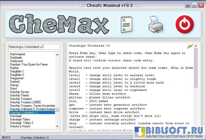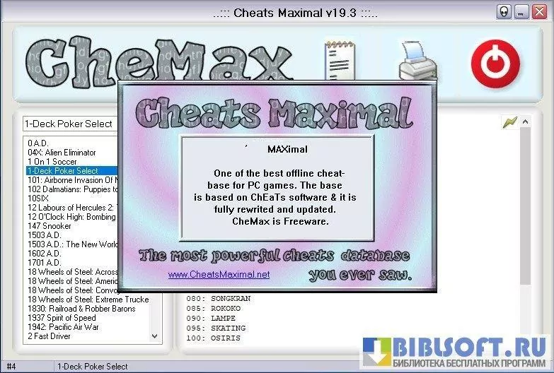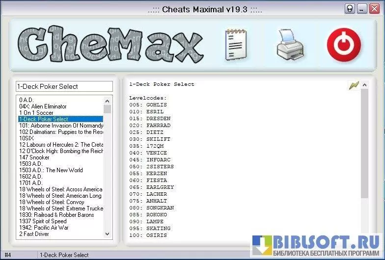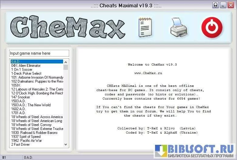 CheMax - компактная и удобная программа-база читов для Windows, представляющая собой локальную коллекцию кодов, пасхалок и подсказок для компьютерных и консольных игр; предназначена для быстрого поиска и копирования игровых кодов, не требует постоянного подключения к интернету и работает на большинстве версий Windows.