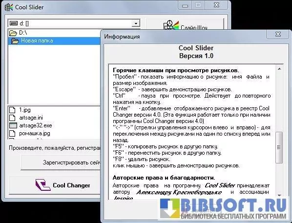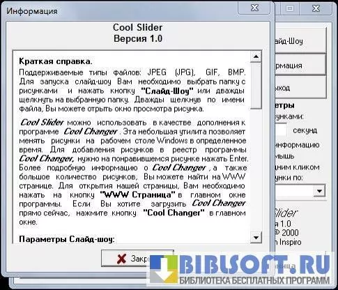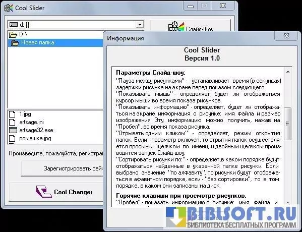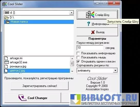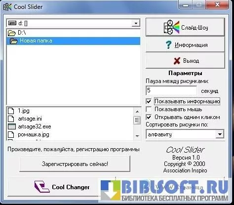 Cool Slider – небольшая полезная программа для просмотра изображений и демонстрации слайд-шоу на компьютерах Windows. Выбирайте нужную папку с графическими файлами, задавайте время паузы между рисунками, нажмите кнопку «Слайд-шоу» - все изображения будут показаны на экране с небольшой задержкой.