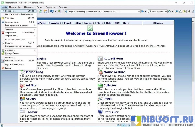 Благодаря встроенному фильтру GreenBrowser блокирует рекламу и всплывающие окна. Для быстрого запуска любимых сайтом можно использовать горячие клавиши. В программу интегрированы менеджер закачек и панель поиска, где представлены все популярные поисковики. Для более удобной работы предусмотрена панель быстрого доступа с 16 фреймами. Незаменимая функция – возможность удалить одним кликом все следы пребывания в Глобальной Паутине: куки, кэш, логины, пароли и т.д. По усмотрению пользователя браузер может блокировать загрузку flash-анимации, изображения, апплеты и скрипты. Программа подойдет всем, кто решил отказаться от Internet Explorer, но при этом хочет использовать что-то привычное.
