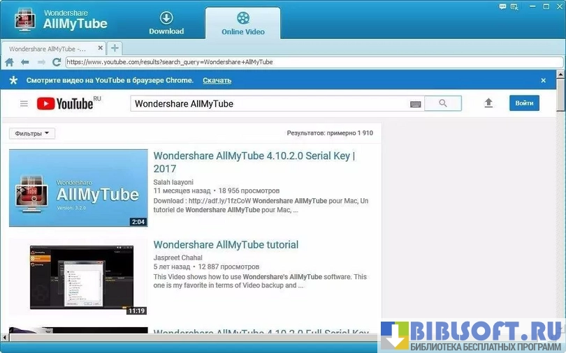 Работая с программой, обратите внимание на ее особенности. Wondershare AllMyTube предлагает два способа загрузки онлайн-видео. Первый заключается в том, что в программу вводится URL-адрес нужного для загрузки видео. Второй — это плагин для браузера, позволяющий запускать загрузку одним щелчком мыши. Оба способа интуитивно понятны.