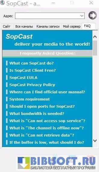 SopCast представляет собой программный комплекс, включающий в себя SopPlayer (модуль для просмотра через интернет телеканалов и видео трансляций) и SopServer (компонент, позволяющий вести собственную трансляцию).
