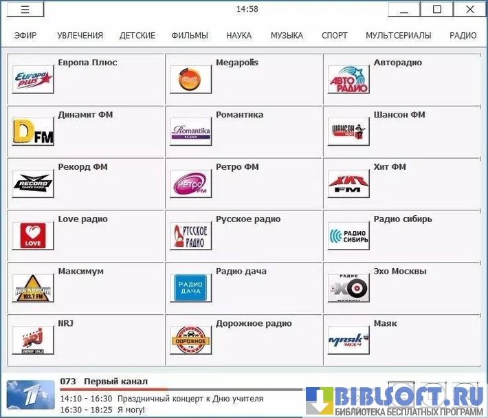 Помимо просмотра прямого эфира ТВ, пользователь может прослушать любой из доступных радиоканалов (Маяк, Романтика, Русское Радио, Шансон, Хит FM, Максимум и пр.)
